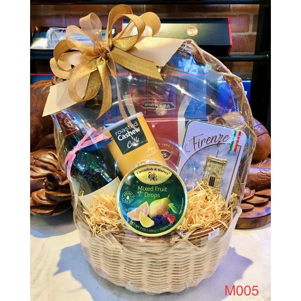 M005 - Giỏ quà đan lát thủ công cao cấp Tết 2022, rượu Vang cao cấp, hạt điều mật ong, kẹo Đức